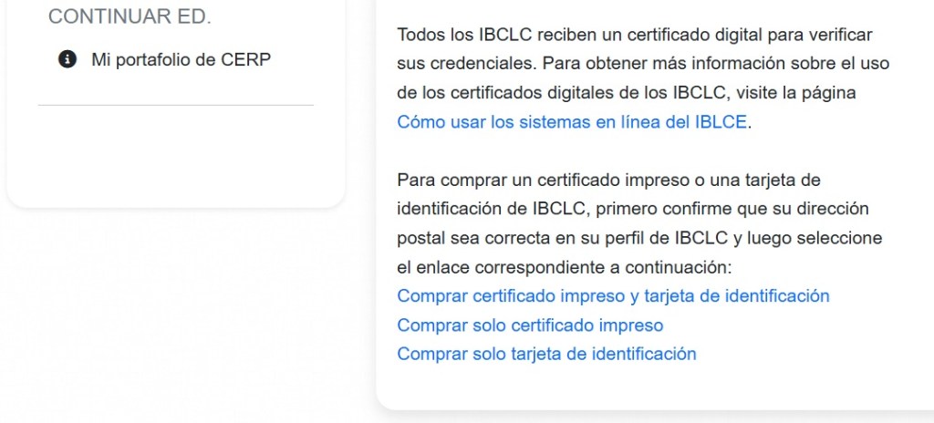 Los IBCLC actuales pueden comprar un certificado impreso o una tarjeta de identificación en su cuenta de gestión de credenciales en línea.