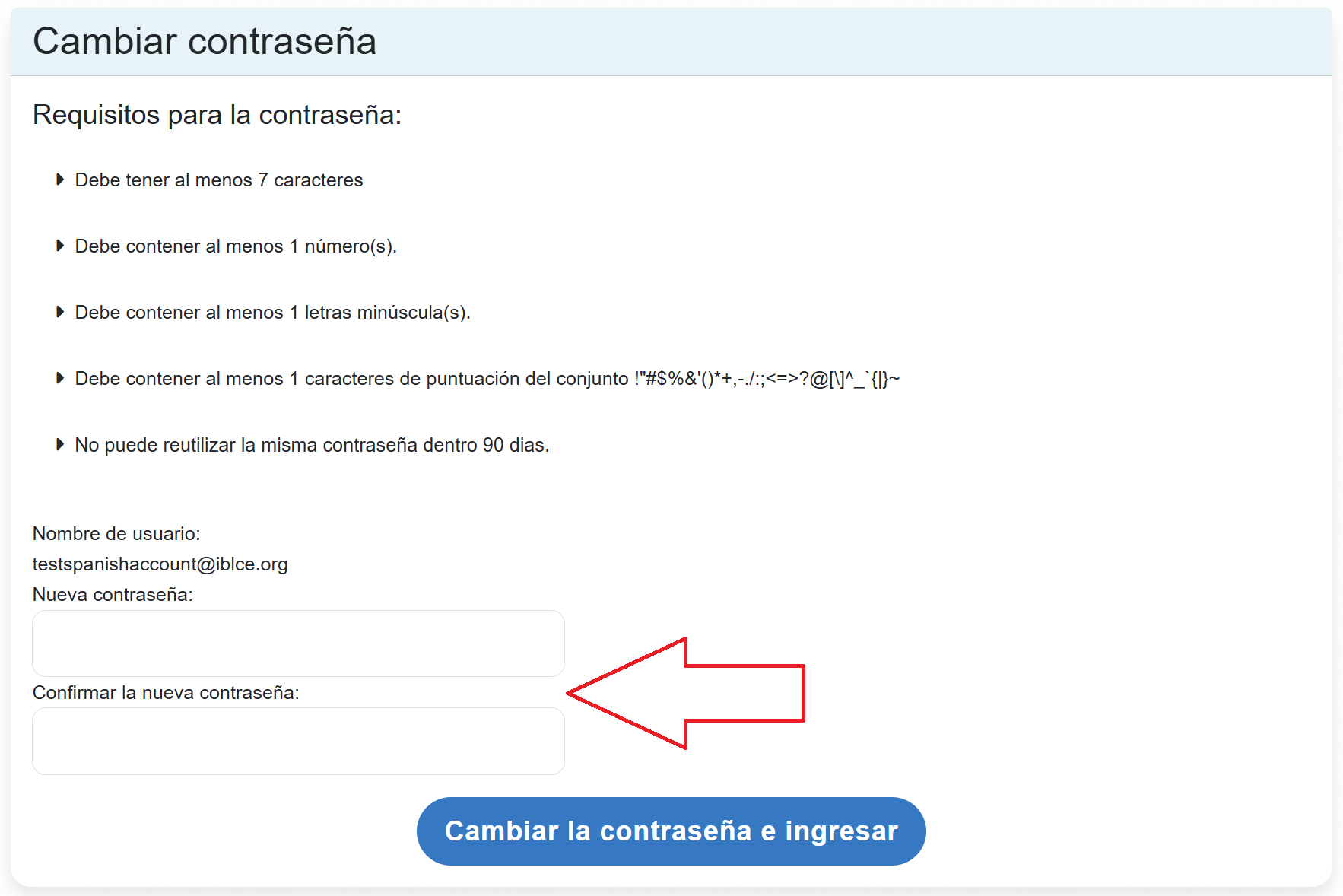 El enlace le dirigirá a una página donde podrá restablecer su contraseña ingresándola dos veces y, a continuación, haciendo clic en «Cambiar la contraseña e ingresar».