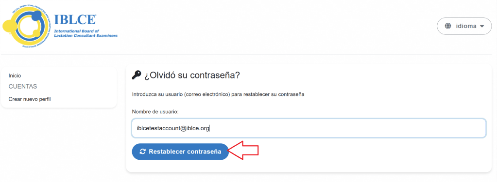 Vaya al sistema en línea de gestión de credenciales del IBLCE. Cambie el idioma de la pagina de IBLCE al español y haga clic en “Restablecer aquí”.